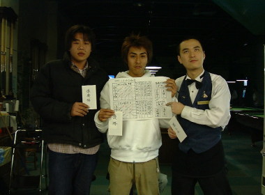 A−1 the V 2001,1,13 優 勝 中村 悠太 準優勝 亘 健士 第3位 広野 光 今年最初の試合とあって 参加者も多く顔合わせ会のような形で始まりましたが お互いに 噛合う形になりアベレージ勝負のかたちで 1点に泣く試合展開の中、唯一ただ一人全勝で勝ち進みそのまま初優勝してしまいました 中村君 同じく初入選を果たした 亘君今後の試合に是非期待したいと思います。今年は、若手・新人の年であれ・・・・・ |