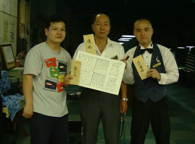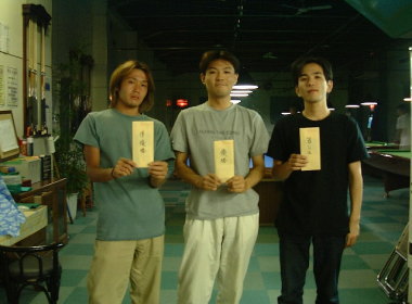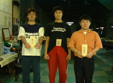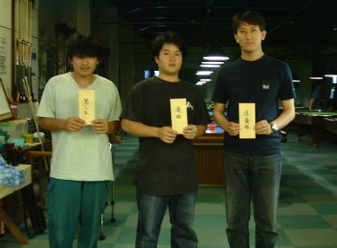 2・4ウィークリー・2 優 勝 菊井 擁平 準優勝 山下 武司 第3位 田村 守 今回の大会は時間ぎりぎりになってのエントリーが多くスタートも少し遅くなってしまい、皆さんに迷惑をかけてしまいました。試合のほうは、決勝進出常連組(Aクラス)のなかにCクラスより2名が勝ち残りそのまま見事入賞してしまいました。準優勝の山下君は、初挑戦での出来事で本当に嬉しそうでした。選手の皆さん お疲れ様でした。 |
