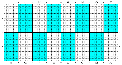 - 短クッションのセンターを結ぶ線と長クッションの各ポイントどうしを結ぶ7本の線で区切られた16個の区画にそれぞれA〜Pを付けます.